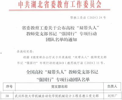 他从教近20年,担任机械国家级实验教学示范中心主任、湖北省机械设计教学研究会副理事长、湖北省机械工程学会工业自动化专委会理事。他先后获全国教师教学创新大赛一等奖、首批全国高校“双带头人”教师党支部书记工作室(负责人)、湖北省教学成果一等奖3项、国家教学成果二等奖1项;主持及参与国家科技支撑计划、国家自然科学基金等50余项,发表科研论文60余篇,授权发明专利14项,获湖北省科技进步一等奖1项、二等奖1项,中国机械工业科学技术三等奖1项;指导员工获全国老员工机械创新设计大赛等国家级奖励40余项,省级奖励60余项,指导国家级老员工创新创业项目4项,指导员工获省优学士学位论文3篇,获评湖北省优秀创新创业导师和湖北省师德先进个人。