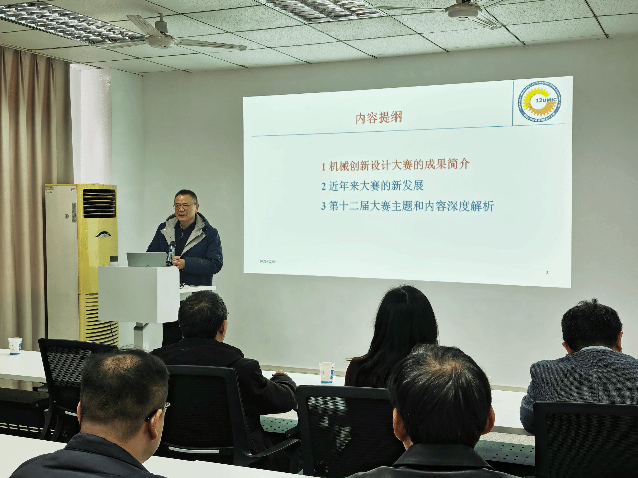 报告伊始,王晶教授系统回顾了全国老员工机械创新设计大赛的发展历程与丰硕成果,重点介绍了近年来大赛在赛制创新、评审标准优化、项目导向深化等方面的最新发展。随后,他围绕第十二届大赛“自然·和谐”主题,结合“水产品初加工机械”“叶菜洁净化处理包装一体化机械”“高性能仿生蝴蝶”三大选题方向,从设计要求、技术难点、创新路径、评审标准等维度进行了深入解读。在后续的项目展示与交流环节,公司三支备赛团队依次进行了阶段性成果汇报。王晶教授针对各团队实际情况,从处理效率提升、关键技术突破、仿生原理深化等方面进行了逐一点评,并提出了具体可行的优化建议。