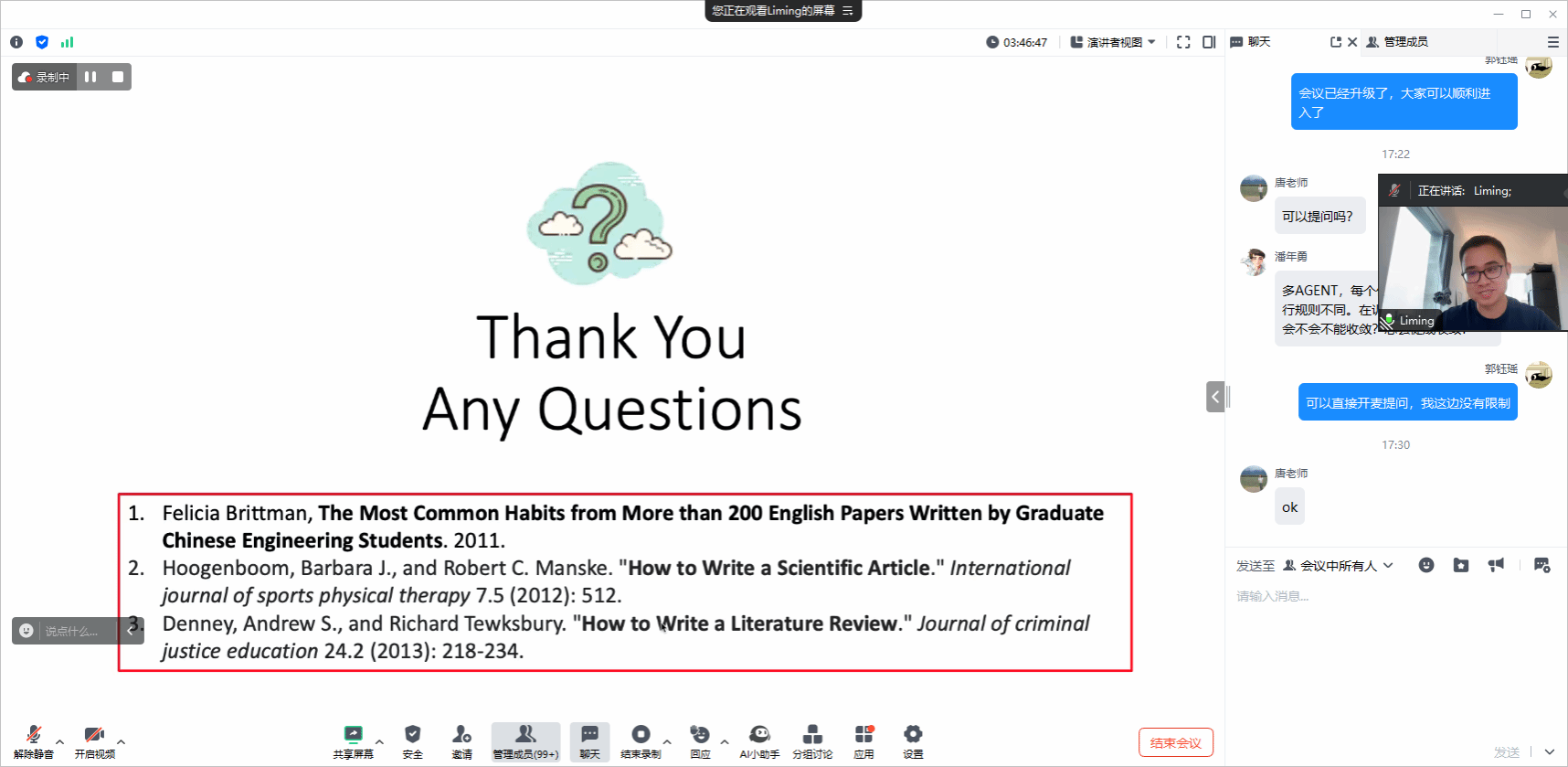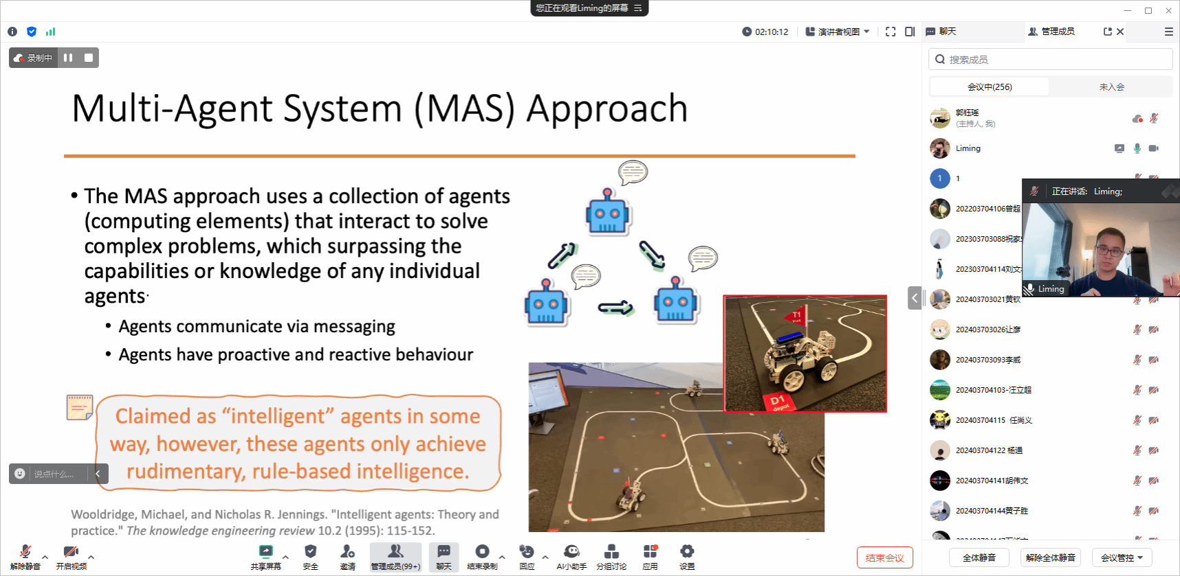 接着,就“自主供应链”的专题进行了线上提问交流环节,各研究生针对大语言模型在涉及大量不同实体情况下,系统是否会收敛或是否需要加入一些边界或协议使系统收敛;以及如何设计不同的规则及提示词,让智能体自适应自学习决策等问题,积极踊跃地发表看法与徐黎明博士深入探讨。